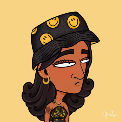 Collection Depressed Citizens Artist Juls Description ART. No team, no project, no future. Depressed Citizens is an urban & existential Art expression on Ordinals. In a parallel universe, "THEI" control us. DC unites against toxic society, encouraging critical thinking. 100% hand made collection that took Juls more than 6 months of daily work. Name Citizen#2341 Origin Asian & Pacific islander Gender Woman Necklace Gold layered necklace Hat Smiley bucket hat Mustache Beard No beard Glasses No Glasses Earrings Tragus star earring Hair Style Long wavy Clothes Golden black halterneck top Tattoo Butterfly tattoo Star Background Without stars