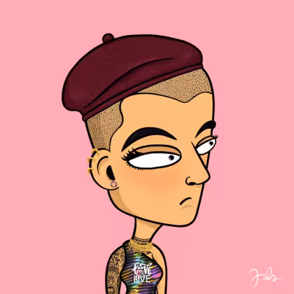 Collection Depressed Citizens Artist Juls Description ART. No team, no project, no future. Depressed Citizens is an urban & existential Art expression on Ordinals. In a parallel universe, "THEI" control us. DC unites against toxic society, encouraging critical thinking. 100% hand made collection that took Juls more than 6 months of daily work. Name Citizen#2185 Origin Caucasian non hispanic Gender Woman Necklace Pre-Columbian necklace Hat Burgundy beret Mustache Beard No beard Glasses No Glasses Earrings Helix ring trio Hair Style Shaved head Clothes Love is love one shoulder crop Tattoo Maya tattoo Star Background Without stars