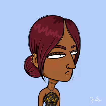 Collection Depressed Citizens Artist Juls Description ART. No team, no project, no future. Depressed Citizens is an urban & existential Art expression on Ordinals. In a parallel universe, "THEI" control us. DC unites against toxic society, encouraging critical thinking. 100% hand made collection that took Juls more than 6 months of daily work. Name Citizen#2187 Origin Hispanic Gender Woman Necklace Choker Hat No Hat Mustache Beard No beard Glasses No Glasses Earrings Helix ring trio Hair Style Low bun Clothes Golden black halterneck top Tattoo No Tattoo Star Background Without stars