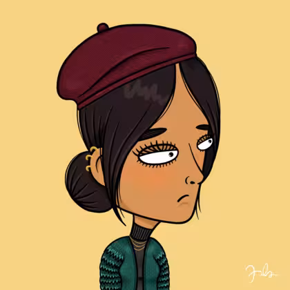 Collection Depressed Citizens Artist Juls Description ART. No team, no project, no future. Depressed Citizens is an urban & existential Art expression on Ordinals. In a parallel universe, "THEI" control us. DC unites against toxic society, encouraging critical thinking. 100% hand made collection that took Juls more than 6 months of daily work. Name Citizen#1646 Origin Asian & Pacific islander Gender Woman Necklace Gold layered necklace Hat Burgundy beret Mustache Beard No beard Glasses No Glasses Earrings Helix ring trio Hair Style Low bun Clothes Black turtleneck women's sweater Tattoo No Tattoo Star Background Without stars