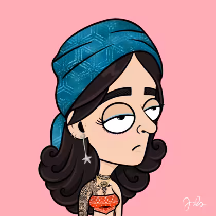 Collection Depressed Citizens Artist Juls Description ART. No team, no project, no future. Depressed Citizens is an urban & existential Art expression on Ordinals. In a parallel universe, "THEI" control us. DC unites against toxic society, encouraging critical thinking. 100% hand made collection that took Juls more than 6 months of daily work. Name Citizen#3297 Origin Caucasian non hispanic Gender Woman Necklace Gold layered necklace Hat Printed head scarf Mustache Beard No beard Glasses No Glasses Earrings Upper lobe rings Hair Style Long wavy Clothes Red bandana crop top Tattoo Maya tattoo Star Background Without stars