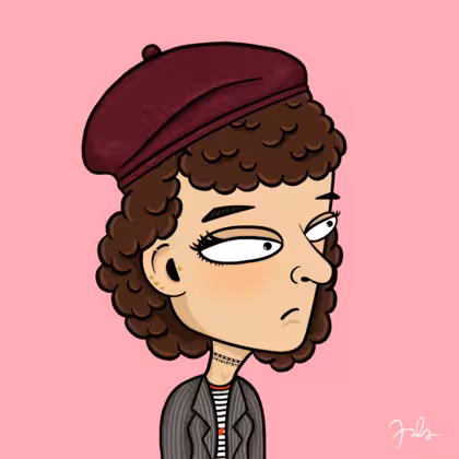 Collection Depressed Citizens Artist Juls Description ART. No team, no project, no future. Depressed Citizens is an urban & existential Art expression on Ordinals. In a parallel universe, "THEI" control us. DC unites against toxic society, encouraging critical thinking. 100% hand made collection that took Juls more than 6 months of daily work. Name Citizen#2158 Origin Caucasian non hispanic Gender Woman Necklace Choker Hat Burgundy beret Mustache Beard No beard Glasses No Glasses Earrings Tragus star earring Hair Style Curly Clothes Marine heart long-sleeve shirt Tattoo No Tattoo Star Background Without stars