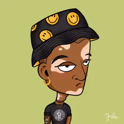 Collection Depressed Citizens Artist Juls Description ART. No team, no project, no future. Depressed Citizens is an urban & existential Art expression on Ordinals. In a parallel universe, "THEI" control us. DC unites against toxic society, encouraging critical thinking. 100% hand made collection that took Juls more than 6 months of daily work. Name Citizen#1395 Origin Unique Gender Man Necklace Gold layered necklace Hat Smiley bucket hat Mustache Beard No beard Glasses No Glasses Earrings Rook hoop Hair Style Shaved head Clothes BLM men T-shirt Tattoo Maya tattoo Star Background Without stars