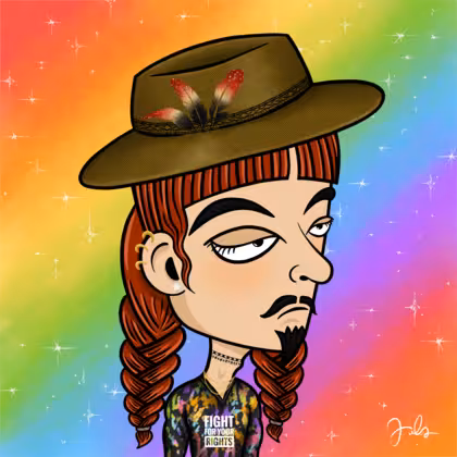 Collection Depressed Citizens Artist Juls Description ART. No team, no project, no future. Depressed Citizens is an urban & existential Art expression on Ordinals. In a parallel universe, "THEI" control us. DC unites against toxic society, encouraging critical thinking. 100% hand made collection that took Juls more than 6 months of daily work. Name Citizen#3210 Origin LGBT-Q+ Gender Non-binary Necklace Gold layered necklace Hat Fedora hat Mustache Beard Handlebar & chin puff Glasses No Glasses Earrings Helix ring trio Hair Style Double braids with bangs Clothes Fight for your rights long-sleeve shirt Tattoo No Tattoo Star Background With stars