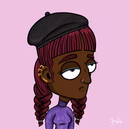 Collection Depressed Citizens Artist Juls Description ART. No team, no project, no future. Depressed Citizens is an urban & existential Art expression on Ordinals. In a parallel universe, "THEI" control us. DC unites against toxic society, encouraging critical thinking. 100% hand made collection that took Juls more than 6 months of daily work. Name Citizen#2521 Origin African descendant Gender Woman Necklace No Necklace Hat Black beret Mustache Beard No beard Glasses No Glasses Earrings Helix ring trio Hair Style Double braids with bangs Clothes Purple turtleneck sweater Tattoo No Tattoo Star Background Without stars