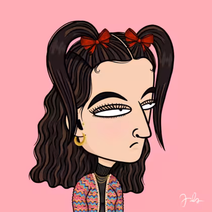 Collection Depressed Citizens Artist Juls Description ART. No team, no project, no future. Depressed Citizens is an urban & existential Art expression on Ordinals. In a parallel universe, "THEI" control us. DC unites against toxic society, encouraging critical thinking. 100% hand made collection that took Juls more than 6 months of daily work. Name Citizen#3195 Origin Caucasian non hispanic Gender Woman Necklace Gold layered necklace Hat Red bow Mustache Beard No beard Glasses No Glasses Earrings Tragus star earring Hair Style Long wavy with space ponytails Clothes Black turtleneck women's sweater Tattoo No Tattoo Star Background Without stars