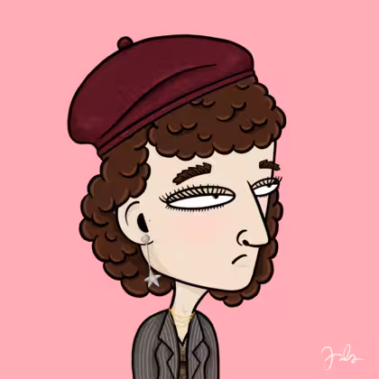 Collection Depressed Citizens Artist Juls Description ART. No team, no project, no future. Depressed Citizens is an urban & existential Art expression on Ordinals. In a parallel universe, "THEI" control us. DC unites against toxic society, encouraging critical thinking. 100% hand made collection that took Juls more than 6 months of daily work. Name Citizen#2977 Origin Caucasian non hispanic Gender Woman Necklace Gold layered necklace Hat Burgundy beret Mustache Beard No beard Glasses No Glasses Earrings Star earring set Hair Style Curly Clothes Old school brown printed shirt Tattoo No Tattoo Star Background Without stars